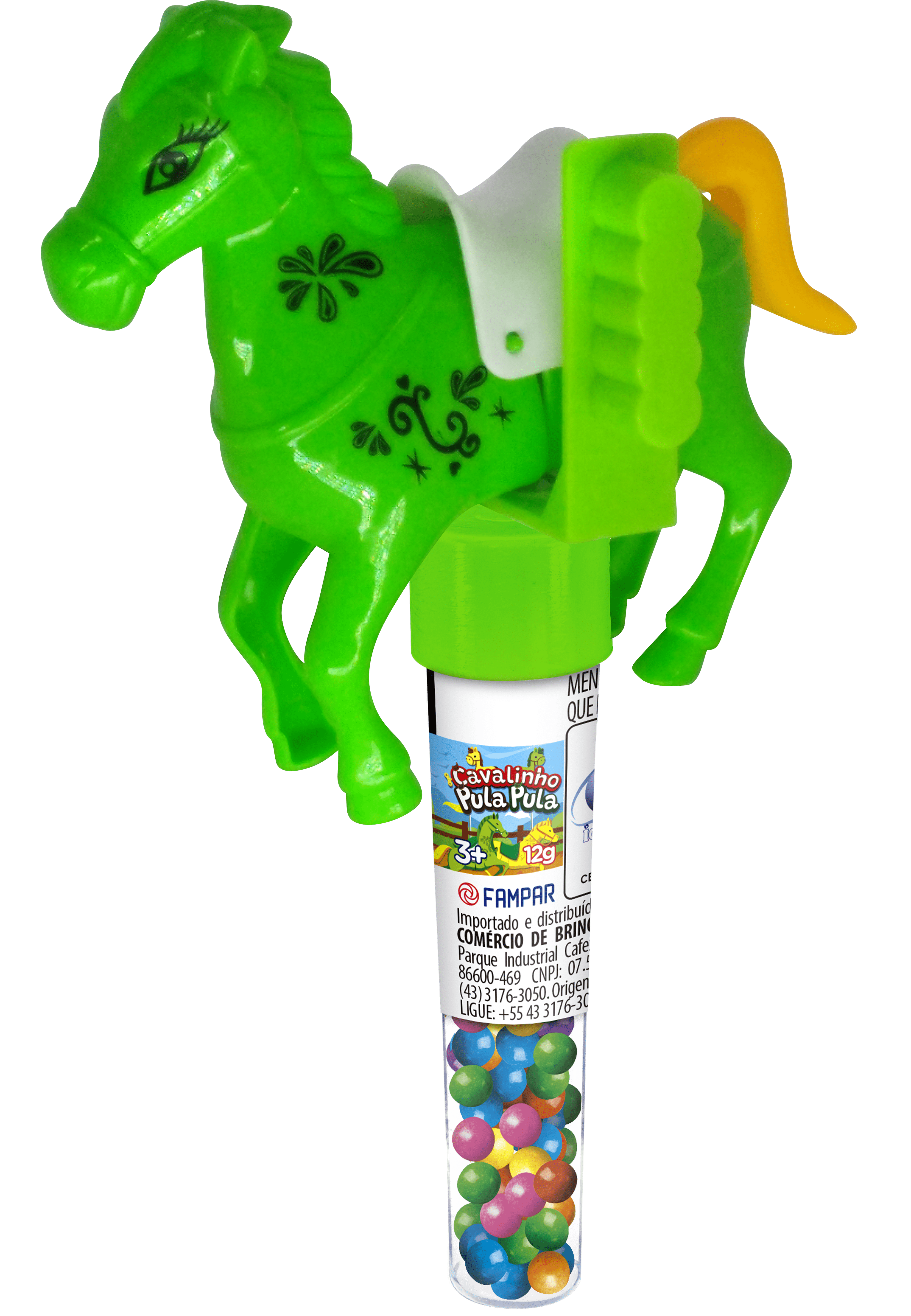 Divertido cavalinho que pula com 12g de confeito sabor tutti-frutti.