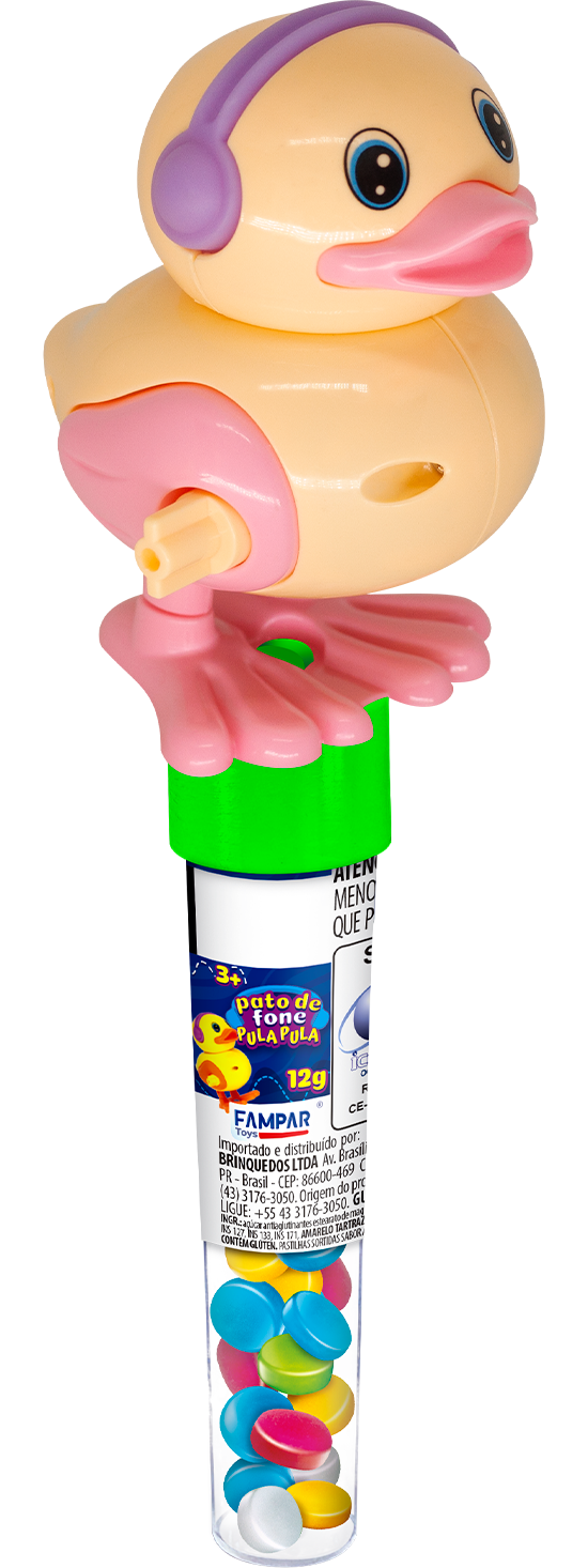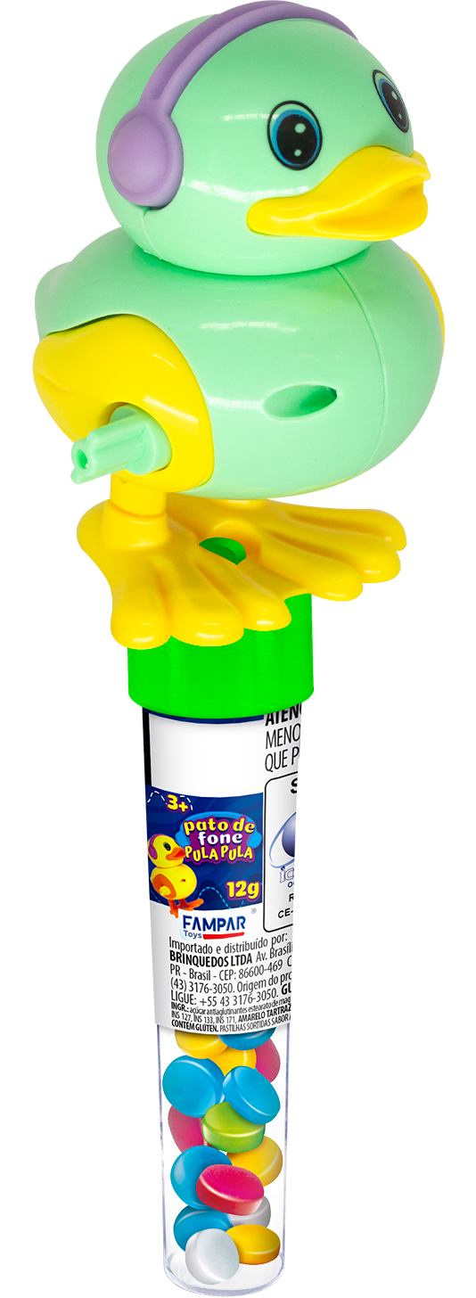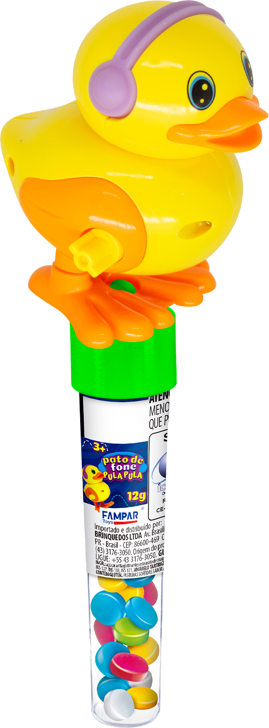 Divertido pato de fone pula pula com 12g de pastilhas sabor artificial de tutti-frutti.