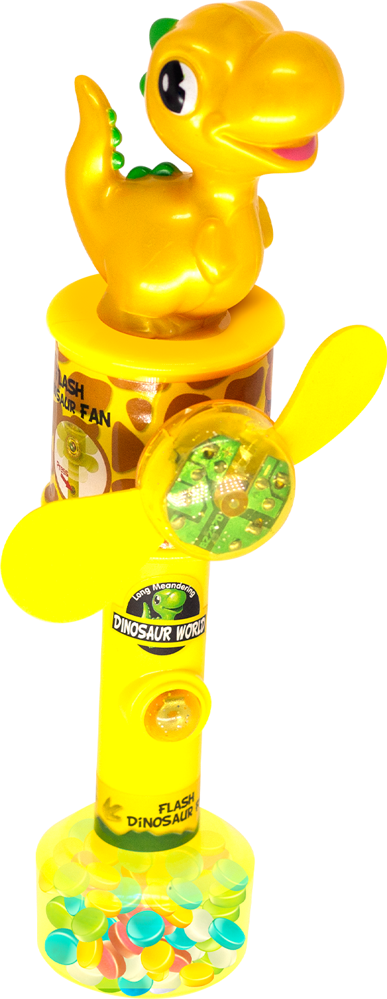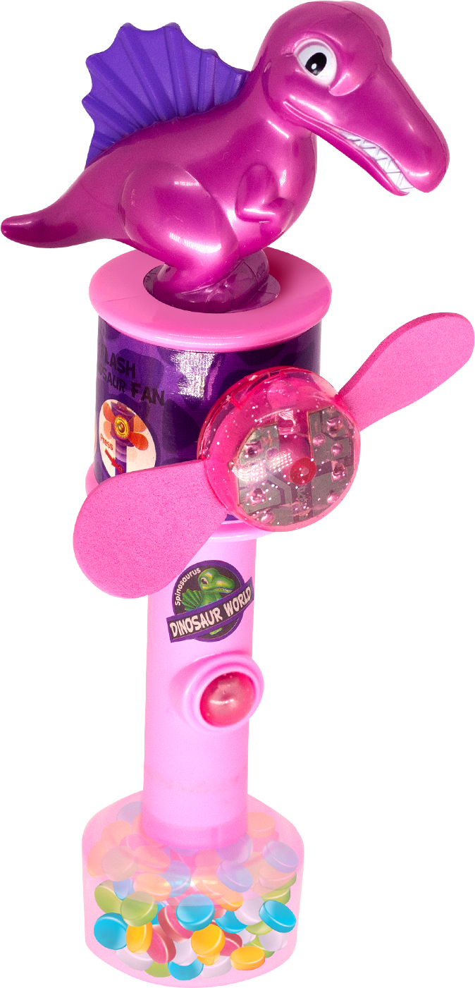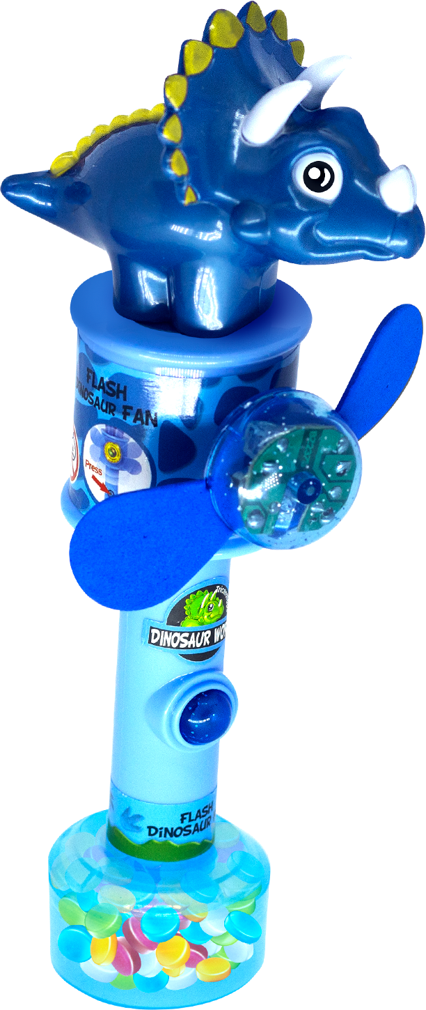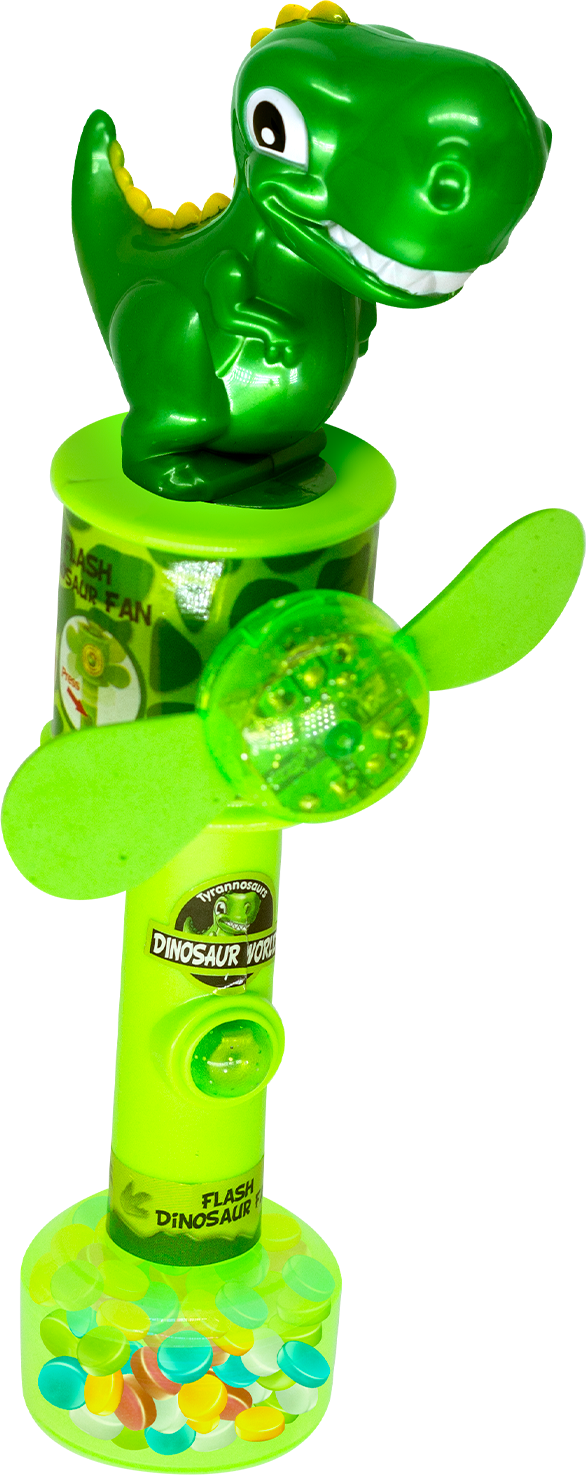 Divertido ventila dino com 15g de pastilhas sortidas no sabor artificial tutti-frutti.